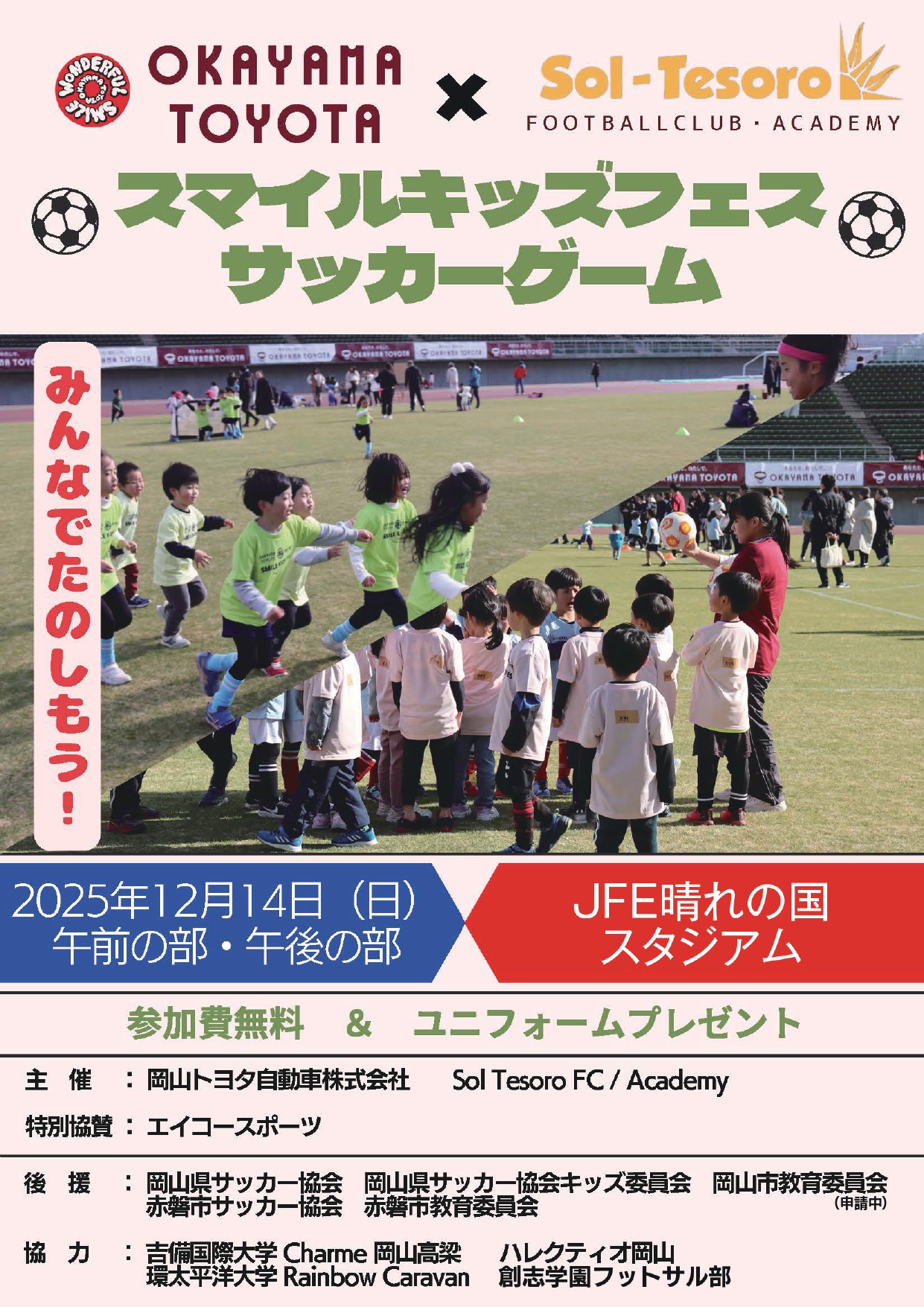2025/12/14(日)、JFE晴れの国スタジアムで開催される未就学児のサッカーイベント参加者の募集が開始されました。 チーム参加、個人参加が可能で、参加者にはオリジナルユニホームをプレゼント!参加料は無料です!